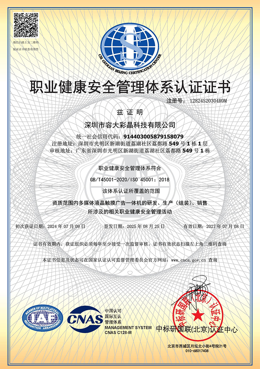 深圳市容大彩晶科技有限公司董事長/朱忠敬先生表示:“員工是我們最寶貴的財富。他們的健康和安全永遠是公司的頭等大事。獲得ISO 45001認證不僅僅是為了滿足標準要求,更是我們企業(yè)文化內(nèi)核的體現(xiàn)。它證明了我們?yōu)槊恳晃粏T工創(chuàng)造一個安全、健康、體面工作環(huán)境的堅定承諾。這將為公司的穩(wěn)健運營和長遠發(fā)展奠定堅實的基礎。”