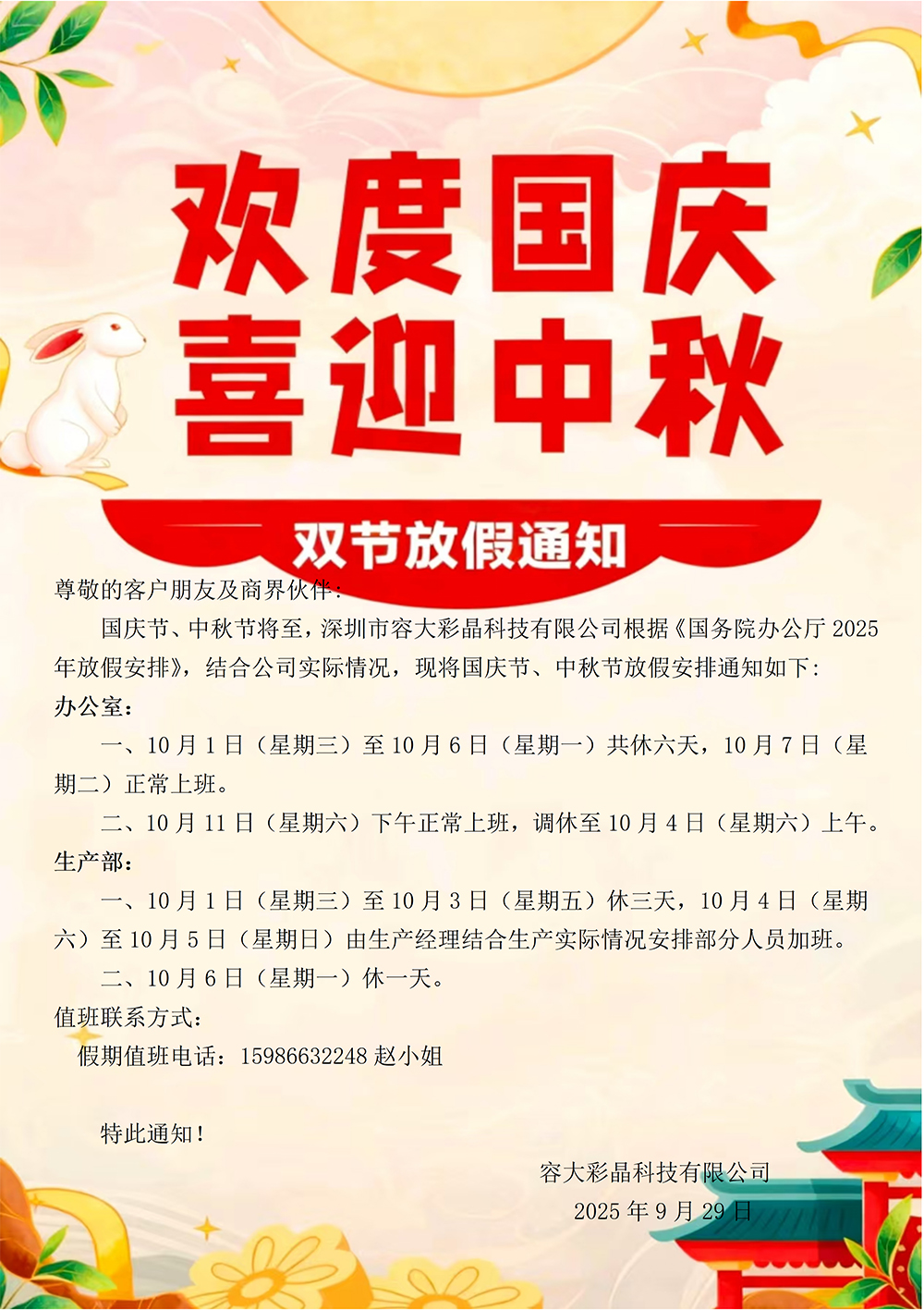 容大彩晶中秋國慶放假通知